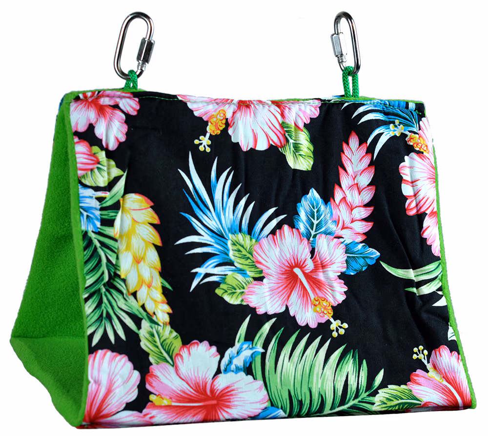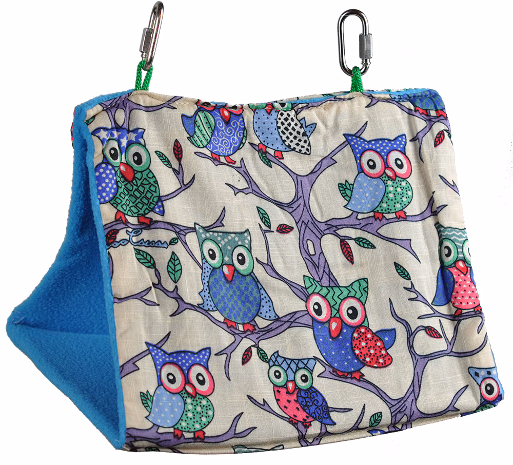 This tent-like bird bed keeps larger-sized birds warm and sheltered inside the cage. They’ll love hiding out inside because it’s lined with soft sherpa. Two open ends ease access and create a fun tunnel in which your bird can also play. Outer fabric is made of tough poly/cotton twill. Easy care – just toss in the machine to wash.