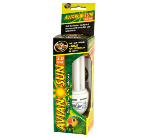 The Avian Sun™ 5.0 UVB Compact Fluorescent provides birds with safe levels of beneficial UVB and UVA for physical and psychological health. UVB enables birds to synthesize vitamin D3 for proper calcium metabolism which is necessary for normal growth, maintenance of strong bones, and egg production. UVA is visible to birds, enabling them to recognize mates, locate food, and identify different species. Without UVA, birds are essentially colorblind!