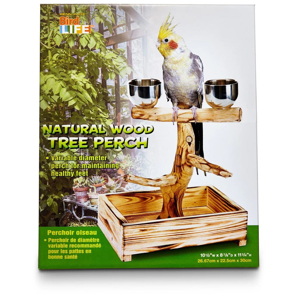 This Bird Life Bird Tree Perch for Small to Medium Birds is made from Natural Wood and includes 2 stainless steel cups and the bottom tray will catch dropped seeds.