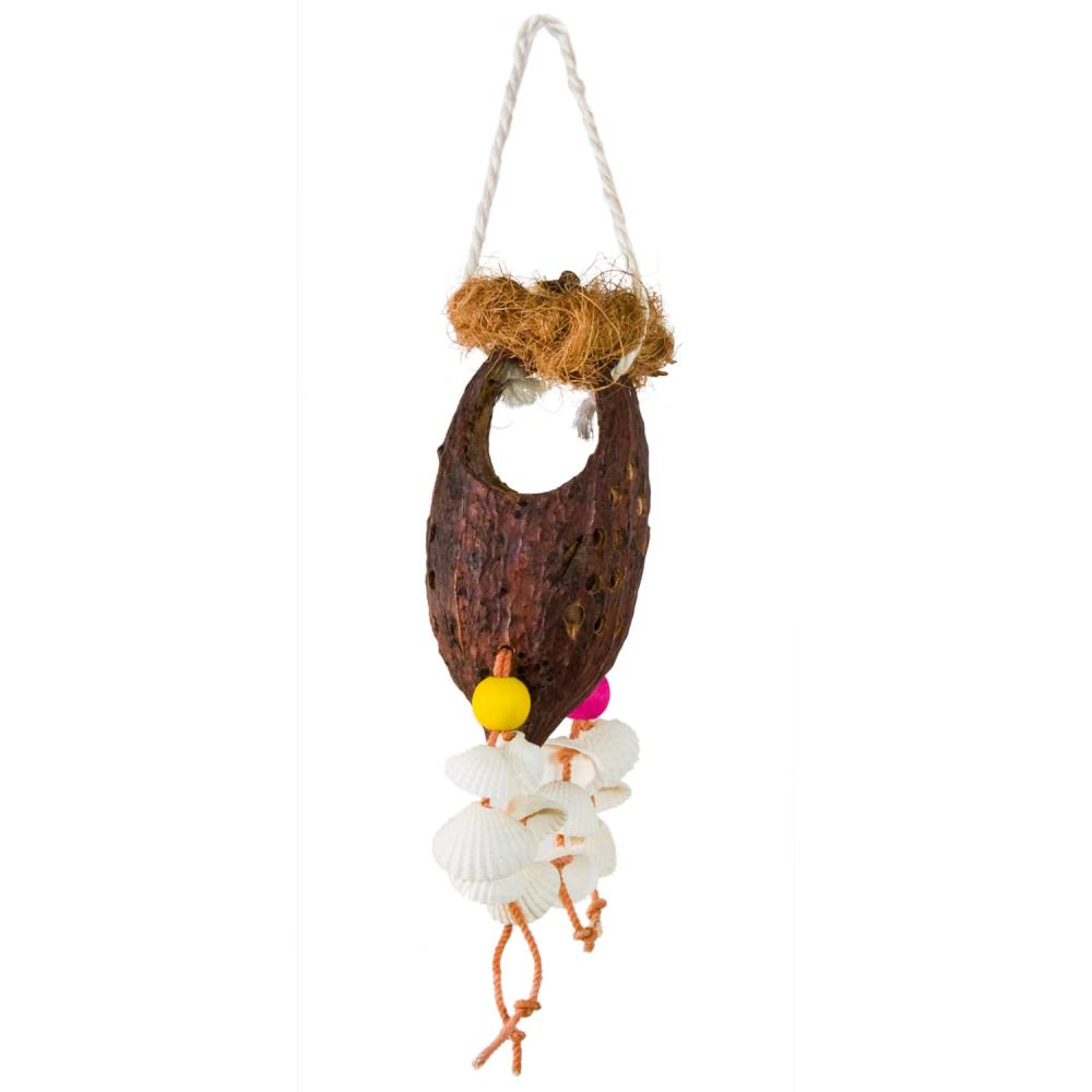 Prevue Pet Products Tropical Teasers Tropical Hideaway Bird Toy 62191 satisfies natural nest building urges while providing great beak exercise. 100% natural, dehydrated, sterilized coconut shells and fibers satisfy plucking, preening, nesting and foraging instincts. Tropical Teasers bird toys may include additional materials, such as sea shells, cotton rope and 100% pet safe, non-toxic plastic beads for beak and tongue exercise. Toy connects easily to cage with quick-link attachment and can be replenished with fibers to extend the life of your toy. Toy is hand made and actual measurements may vary slightly. As always, supervise birds at play. Our Tropical Hideaway 62191 bird toy is approximately 3 1/4″ wide and 10 3/4″ long, ideal for small to medium sized birds.