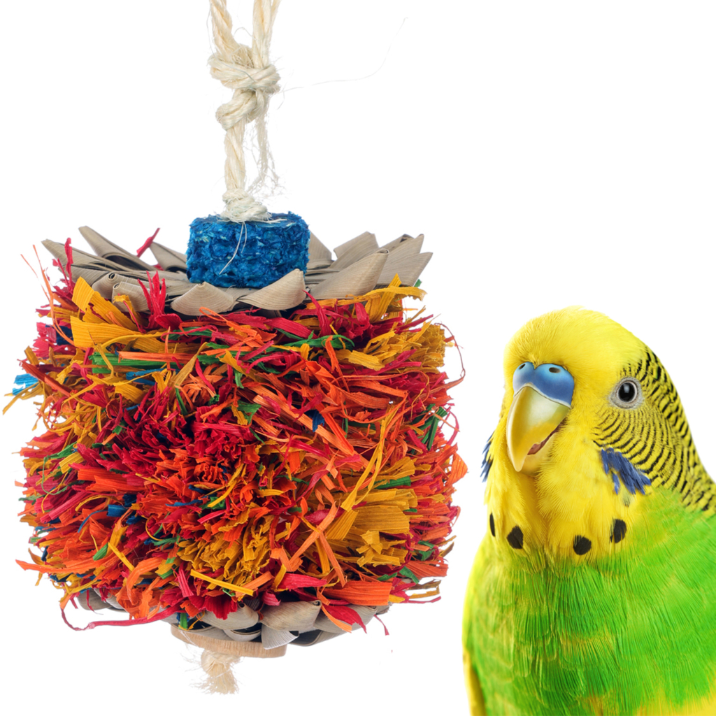- DESIGN FEATURES – Colorful corn husk sandwiched between two crunchy, woven palm flowers and suspended on sisal rope. Attaches to the cage with a bird-safe pear link.