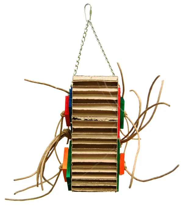 The 791 CHUNKY SHREDDING BLOCK 7.5″ Cube from Zoo-Max Bird Toys is a large shredable block toy. This bird toy has cardboard blocks for its body that are great fun for shredding beaks and legs. Top of the bird toy is included a quick link connector making installation quick and easy in the cage. The body of the bird toy is made from large cardboard shredding blocks. These blocks are excellent for beaks and paws as they are totally shreddable. Between the blocks and on the top and bottom are colorful wooden chew blocks. This simple and attractive bird toy is perfect for pets of all ages and adds fun to foraging to the cage.