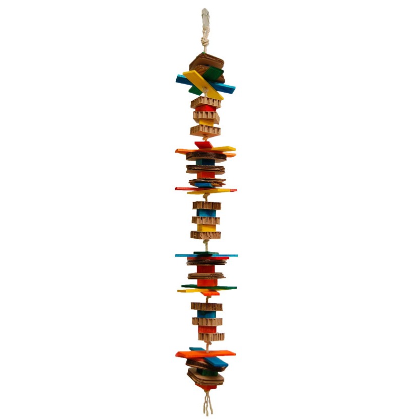 Jumpy bird toy is made of natural paper rope, cotton rope, with several wood parts. Many different shapes including shredded cardboard blocks.